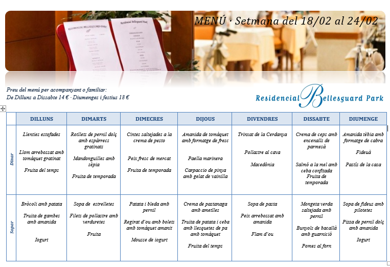 Menú · Setmana del 18 al 24 de Febrer de 2019