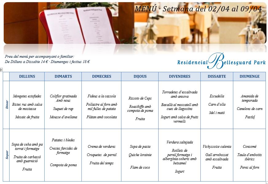Menú · Setmana del 02 al 09 d’abril